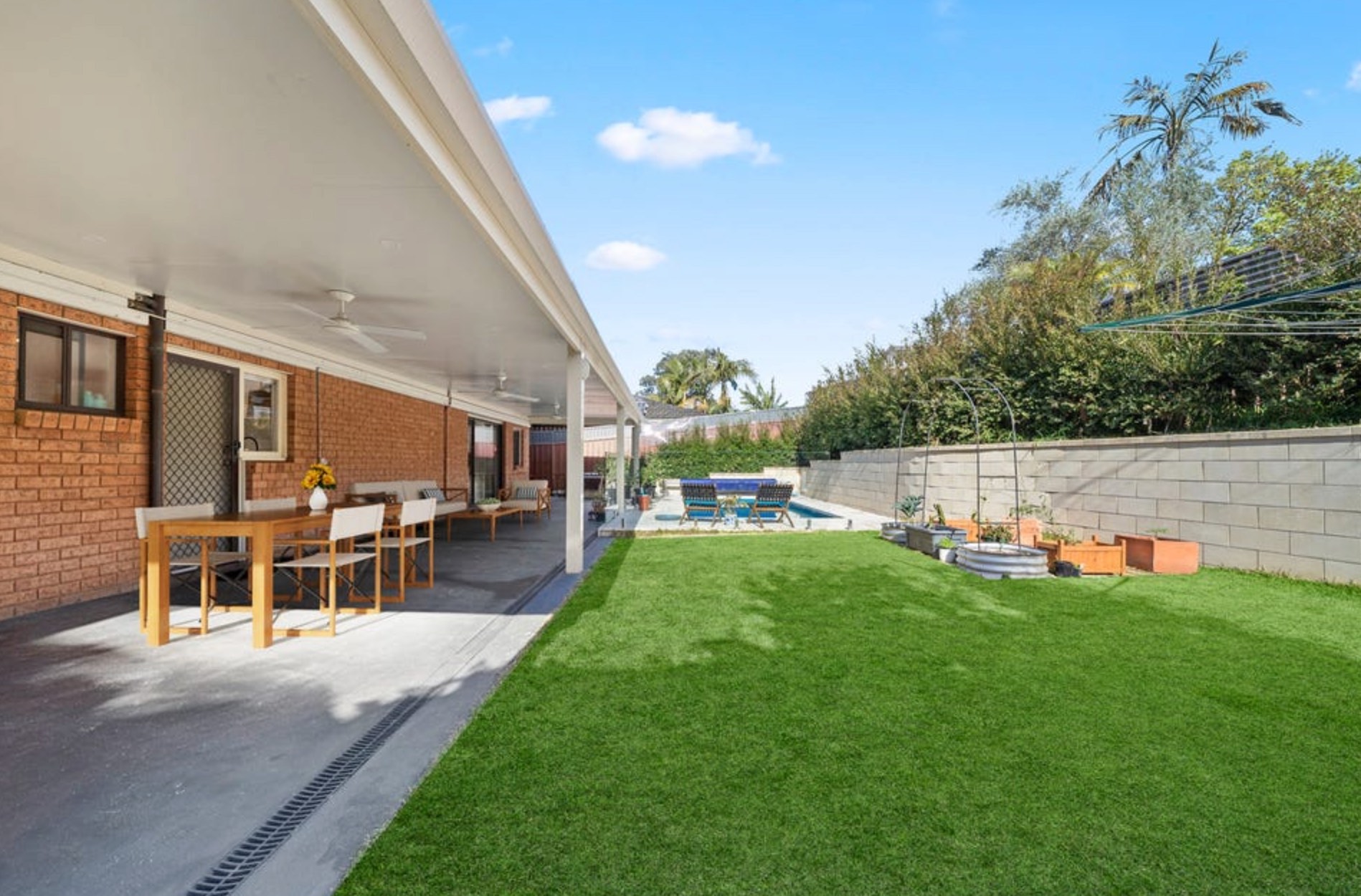 - Covered alfresco terrace overlooks a sparkling saltwater travertine swimming pool and child friendly backyard, perfect for entertaining and year round family enjoyment