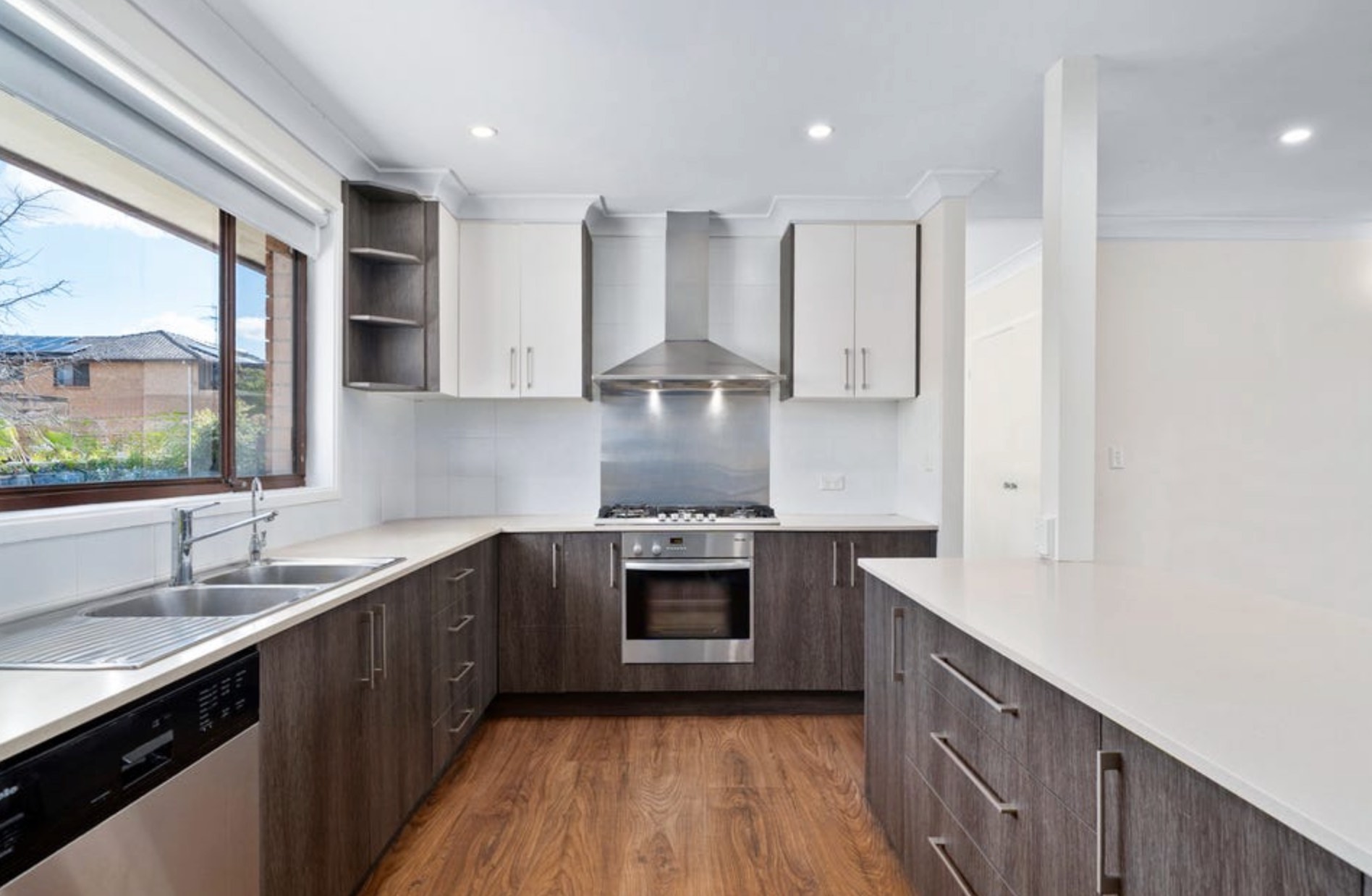 - Contemporary kitchen with stone benchtops, sleek cabinetry, gas cooking, stainless steel appliances, ample storage and breakfast bar, seamlessly connecting to the adjoining living and dining