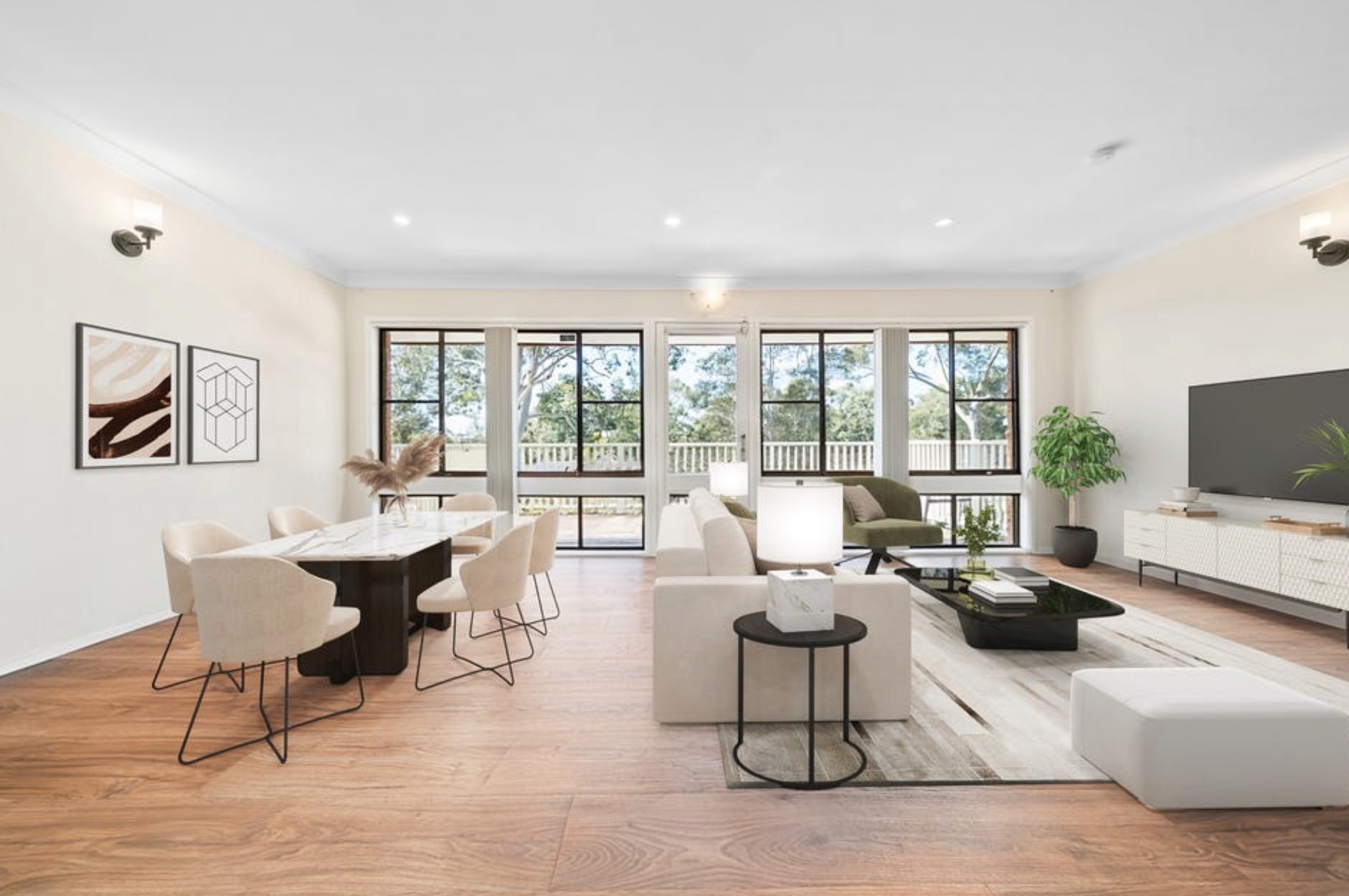 - Spacious entry opens to versatile living and rumpus areas over two levels, featuring timber floors, exposed brick accents, modern lighting, and large windows allowing an abundance of natural light throughout